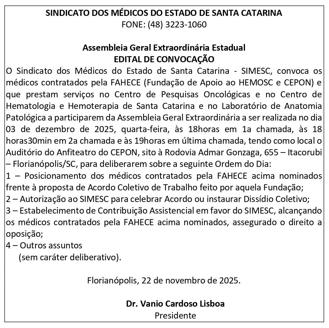 O SIMESC convoca os médicos contratados pela FAHECE que atuam no CEPON e no HEMOSC e que prestam serviços no Centro de Pesquisas Oncológicas e no Centro de Hematologia e Hemoterapia de Santa Catarina e no Laboratório de Anatomia Patológica para a retomada da Assembleia Geral Extraordinária Estadual.
